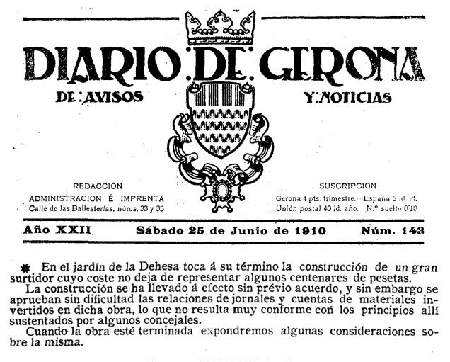 No és una informació aïllada, perquè va acompanyada de notícies prèvies i d'una polèmica municipal per la seva construcció en un moment que no es considerava oportú. El "Diario de Gerona" anava avisant dels avenços de la seva construcció; El 6 de setembre de 1901 publicava que "En el jardin de la Dehesa hemos visto que se están labrando varias piedras que parecen destinadas á formar parte de una fuente ó surtidor que no sabemos donde se piensa colocarla". El 25 de juny de 1910 anunciava que "En el jardín de la Dehesa toca á su término la construcción de un gran surtidor cuyo coste no deja de representar algunos centenares de pesetas", i el 9 de juliol del mateix any comunicava que "Muy adelantadas se hallan ya las obras de construcción del surtidor del jardín de la Dehesa, pero aun han de invertirse algunos jornales antes no quedará totalmente terminado".