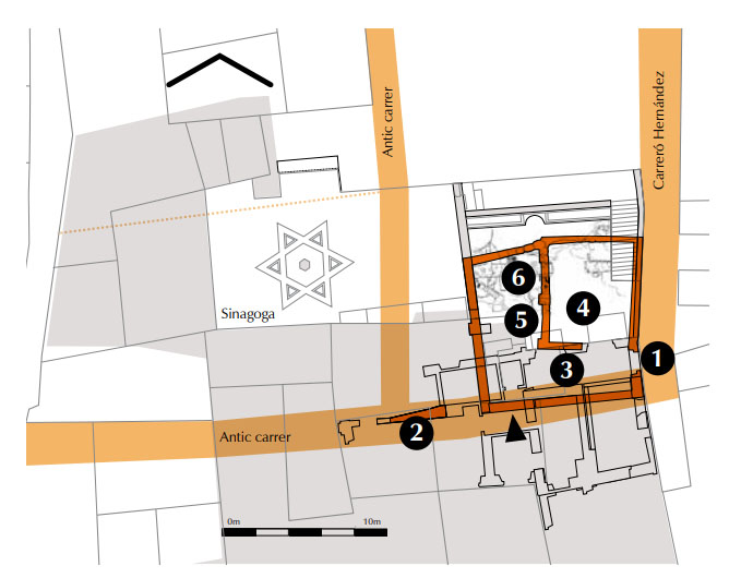 (Ampliar) - La casa Desportal. Dibuix de Jordi Sagrera. "Espais arqueològics del call de Girona". 1) Porta adovellada d’accés a la casa des de l’actual carreró d'Hernàndez - 2) Mur perimetral de la banda de ponent - 3) Vestíbul de la casa - 4 i 5) Estances pavimentades amb opus signinum - 6) Àmbit que ocupa la cisterna. La fletxa indica el punt d'observació. Bibliografia |