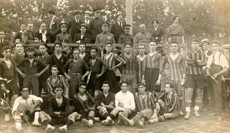 (Ampliar) - Partit de futbol entre la Unió Deportiva Girona i el Calella al camp de futbol de la Devesa, al Camp de Mart, en benefici dels soldats que lluitaven a l'Àfrica. Retrat de grup dels jugadors davant la tribuna d'autoritats civils i militars presents a l'encontre. S'identifica a Jesús Ballestero, president del club. Entre els jugadors, a d'alt d'esquerra a dreta: Viarnés, Padrosa, Bisbe, Viñas, Alvarez i Roca. Asseguts: Casteyó, Pep Gómez, Prats, Fernández i Rustey. 18/02/1921. Autor desconegut. CRDI - Ajuntament de Girona.