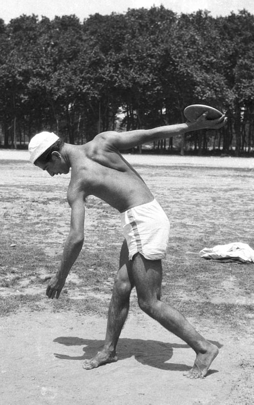 (Ampliar) - Retrat de Fernando Varés Martinell llançant el disc al camp d'esports del Camp de Mart. 1935. Antoni Varés Martinell. CRDI - Ajuntament de Girona.