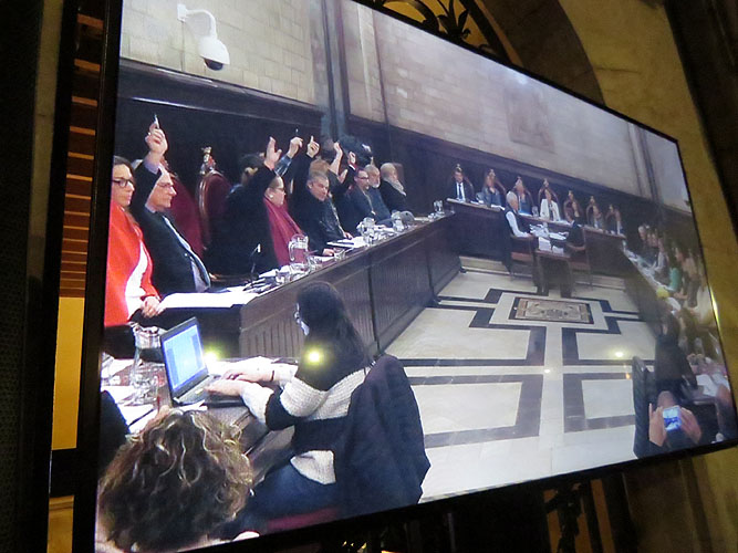 (Ampliar) - La pantalla de l'exterior de l'Ajuntament. Vots favor del canvi. El ple es va seguir amb molta expectació des de la plaça del Vi, on es van concentrar 600 persones, la majoria a favor del canvi de nom, que es van fer sentir amb crits de “Som República!” i xiulets durant les intervencions del PSC, Cs i el PP. Una dotzena de concentrats, un dels quals portava una bandera espanyola, cridaven lemes com ara “Constitució és democràcia ” i xiulaven el discurs de l'alcaldessa. Un dels concentrats es va voler encarar amb membres de "Girona Vota" situats darrere de la pancarta “Democràcia”. La plaça va esclatar en aplaudiments i crits de “Llibertat” quan es va aprovar el canvi.