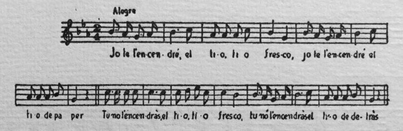 Tu no l'encendràs, | el tio, tio fresco, | tu no l'encendràs, | el tio de detràs", prosseguint les contorsions i els saltets fins que algú de la fila, que a cada posada s'anaven tornant, aconseguia cremar un dels papers i passava a ocupar el lloc del que s'havia deixat encendre el "tio" de paper. Pròpiament, peró en lloc de "tio" havia de ser "tió".