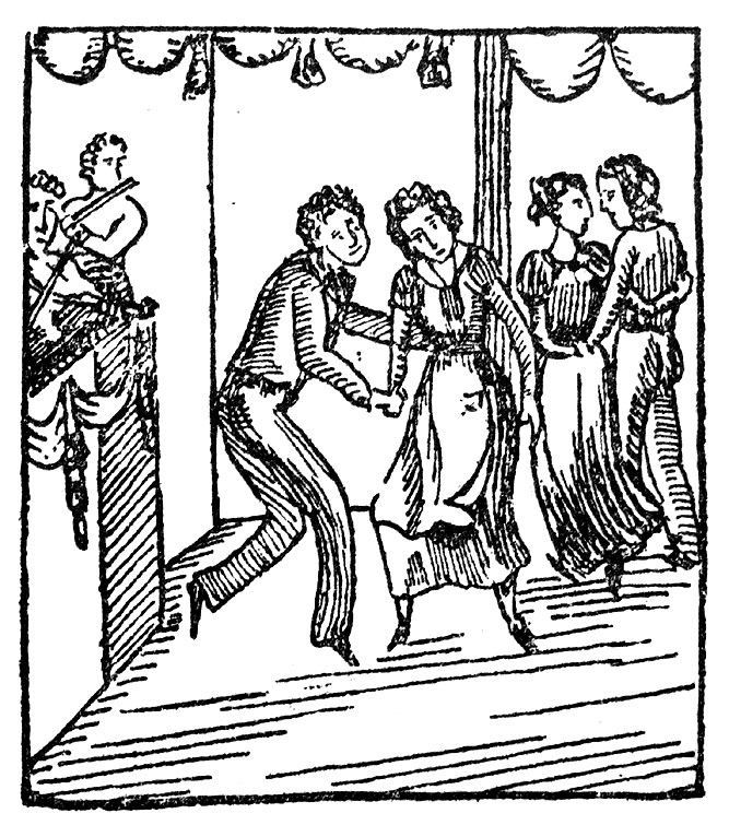 (5) - Quan s'anava al ball pròpiament dit, es deia que s'anava al "ball de les giravoltes" o bé a la "contradansa". El primer, aquell en què la parella s'agafa, començà a introduir-se a Girona cap el 1850, importat de l'Europa Central. La contradansa, setcentista, era passejada i dansada en forma molt semblant a la dels rigodons, que varen ser creats sobre el seu model. Més tard es va començar a ballar "la redova", una mena de masurca, i "l'espanyola", una varietat de la contradansa, però saltada. Als "salons" es ballaven els balls de "quadro" o de quadrilla, rigodons i llancers. - (Tornar al text)