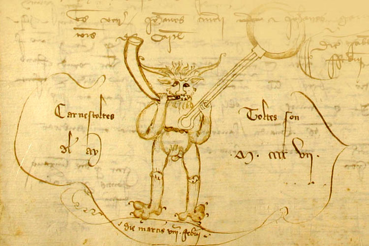 (Ampliar) - Imatge de Carnestoltes, en "Capellut". Notaria de Castelló d'Empúries. Manual de 1407. Arxiu Històric de Girona.
