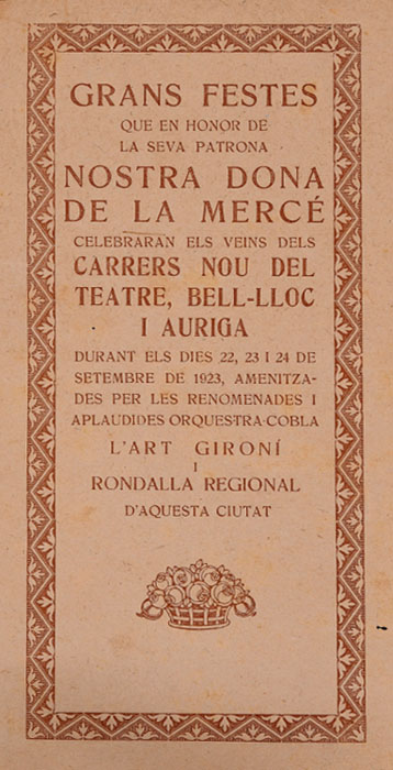 (Ampliar) - Programa de Grans Festes de la Mercè dels veïns dels carrers Nou del Teatre, Bell-Lloc i Auriga durant els dies 22, 23 i 24 de setembre de 1923. Fons Ajuntament de Girona.