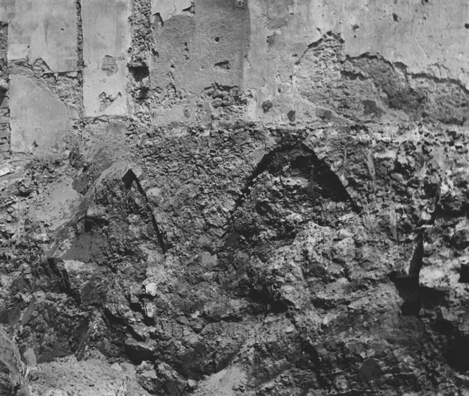 Restes d'arcs apareguts en l'enderrocament de cases de la travessia de l'Auriga per a la construcció de l'edifici Fòrum al carrer Albereda. 1978. Narcís Sans Prats. CRDI - Ajuntament de Girona - (Ampliar)
