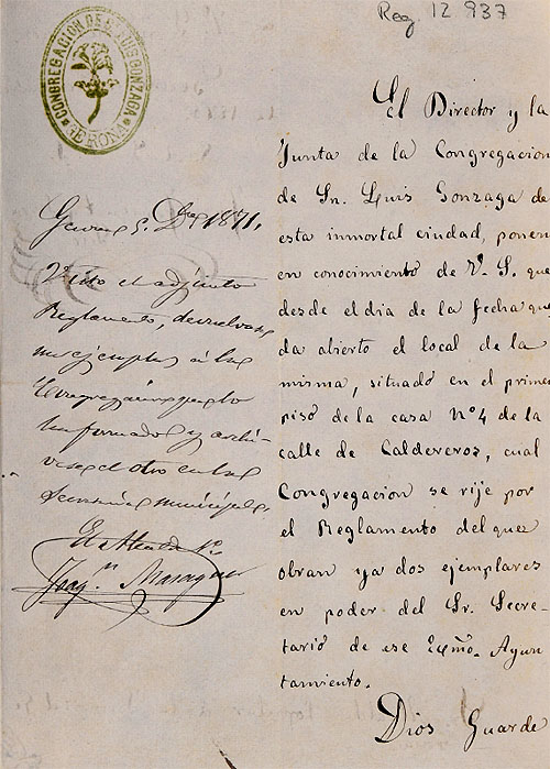 (Ampliar) - Carta de la Congregació de Sant Lluís Gonzaga de Girona (secretari: José Franquet Serra) a l'Ajuntament de Girona. Es comunica que aviat s'obrirà el local de l'entitat ubicat al carrer Calderers. 1871. Fons Ajuntament de Girona.