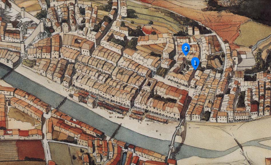 Girona a la 1a meitat del segle XIV. El barri de la Vilanova. 1) el carrer Nou. 2) La Trilla d'en Bordils. Dibuix de Jordi Sagrera - (Ampliar)