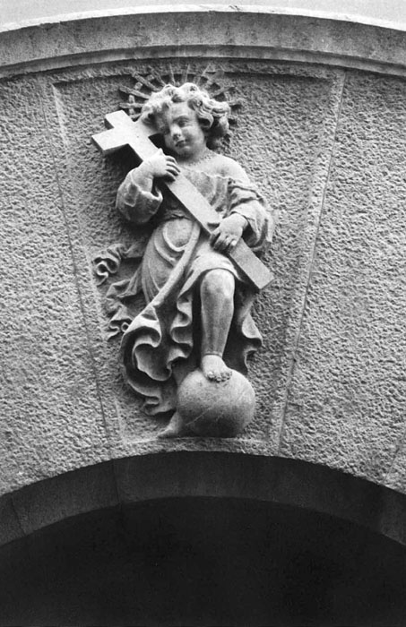 (Ampliar) - Relleu del Nen Jesús, obra de Joan Carrera Dellunder, situat a la dovella superior de la porta del la Llar d'Infants de la fàbrica Grober, al carrer de la Sèquia. L'edifici va ser enderrocat i la imatge es conserva al dipòsit del Museu d'Història. 1985. Carles Mitjà Caballé. CRDI - Ajuntament de Girona.
