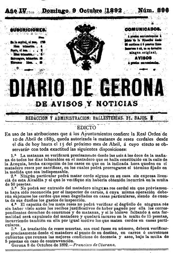 (Ampliar) - Edicte de l'Ajuntament de Girona sobre l'ús de l'escorxador del carrer de la Sèquia. Publicat al 'Diario de Gerona de Avisos y Notícias' del 9/10/1892.