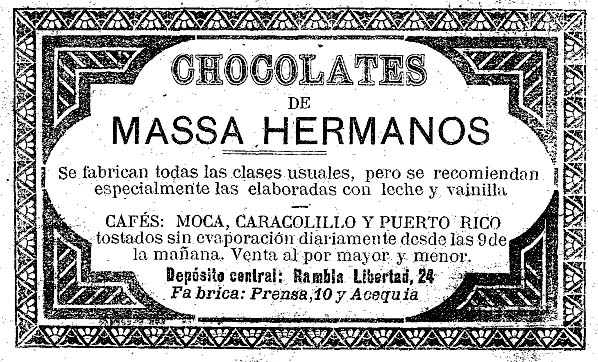 Anunci de la fàbrica de xocolata Massa, publicat al 'Diario de Gerona de Avisos y Notícias' del 16/5/1897. El mateix dia el diari publicava el seu trasllat al carrer de la Sèquia cantonada amb el carrer de la Premsa. L'any següent s'anomenava "La Económica" - (Ampliar)