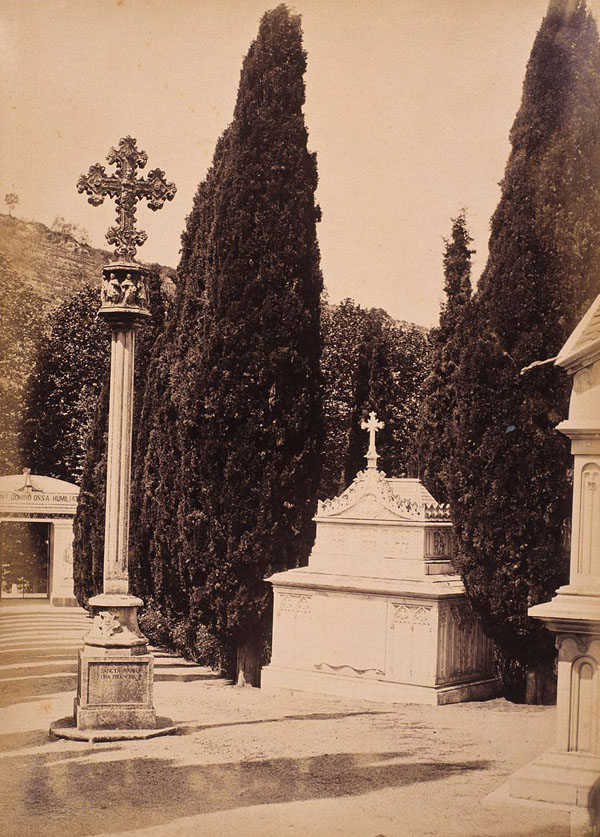 (Ampliar) - Interior del Cementiri Municipal. S'observa un panteó i la Creu en record de tots els morts de la ciutat. 1877. Joan Martí Centelles. CRDI - Ajuntament de Girona.