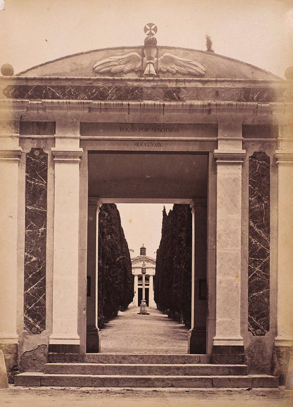 (Ampliar) - Façana del Cementiri Municipal. Al fons, la Creu en record de tots els morts de Girona i la capella neoclàssica. 1877. Joan Martí Centelles. CRDI - Ajuntament de Girona.