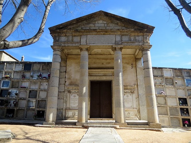 Les restes descansen en diferents apartats de la part superior del conjunt. Cada tomba presenta una làpida que ocupa una de les obertures amb arc de mig punt i columnes amb capitells corintis. El conjunt és coronat amb arquets i la coberta és de ciment, apuntada. Originàriament hi havia hagut una creu a la part superior.