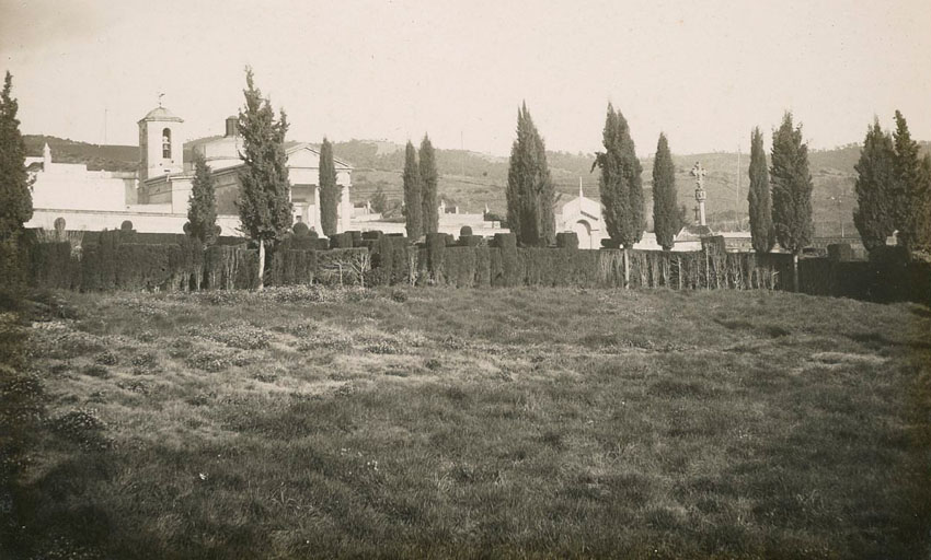 (Ampliar) - Vista del cementiri de Girona. A l'esquerra s'observa el campanar de l'església, i a la dreta la creu de terme. 1932. Josep Jou Parés. CRDI - Ajuntament de Girona.