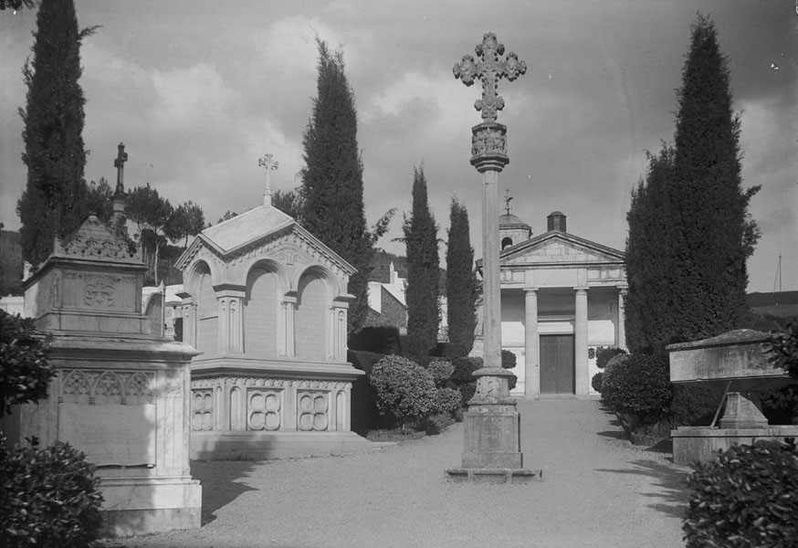 (Ampliar) - Vista parcial del cementiri de Girona amb la creu de pedra en primer pla. Al fons, la capella neoclàssica. 1911-1936. Valentí Fargnoli Iannetta. CRDI - Ajuntament de Girona.