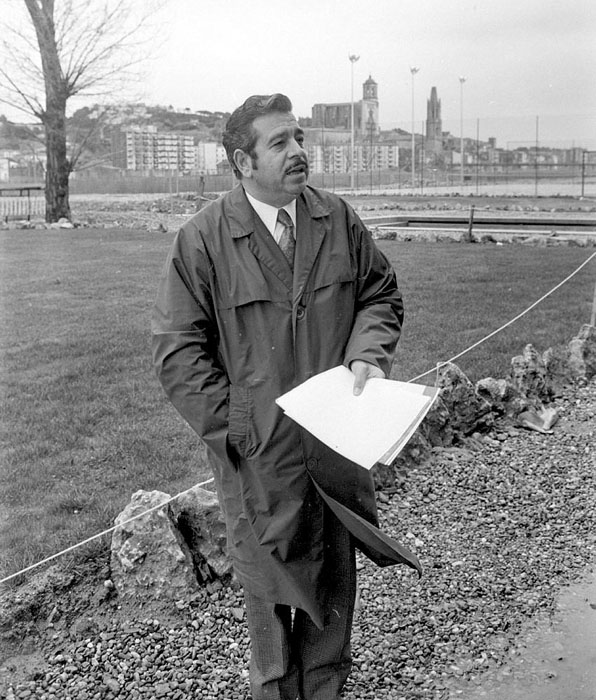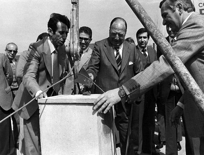 (Ampliar) - Acte de col·:locació de la primera pedra de les instal·lacions esportives del GEiEG a Sant Narcís. Narcís de Carreras i Lluís Bachs Mach col·locant la primera pedra. Febrer 1979. Sebastià Martí. CRDI - Ajuntament de Girona.