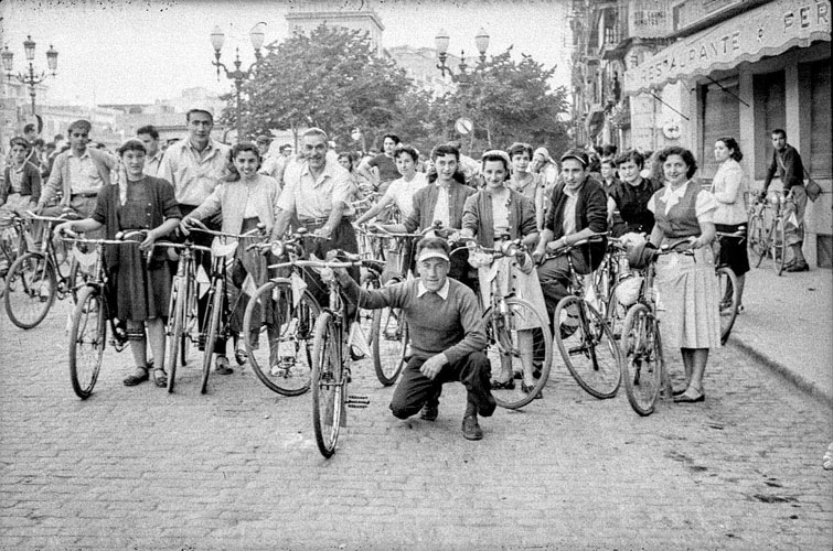 (Ampliar) - Cursa ciclista organitzada pel GEiEG. Sortida dels corredors al passeig General Mendoza. A la dreta, el convent de Sant Francesc de Paula; al fons, la Caserna General Mendoza. 2 de març de 1952. Martí Massafont Costals. CRDI - Ajuntament de Girona.