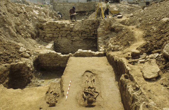 Excavacions al solar de l'antic Hotel dels Italians, al carrer Ciutadans. Esquelets d'època tardo-romana trobats durant l'excavació. 1991. Josep Maria Oliveras Puig. CRDI - Ajuntament de Girona - (Ampliar)
