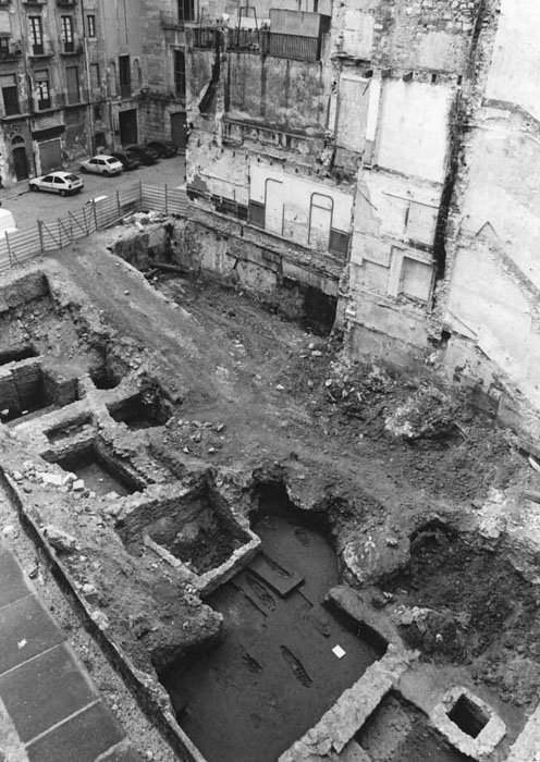 (Ampliar) - Troballa arqueològica durant les obres d'enderrocament de l'antic Hotel Italians, entre el carrer Ciutadans i la plaça Sant Josep. 1991. Jordi S. Carrera. CRDI - Ajuntament de Girona.