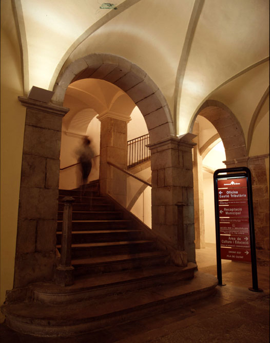 (Ampliar) - Detall de l'escala principal d'accés a la Oficina de Gestió Tributària i a d'altres oficines municipals rehabilitades a l'antic Hotel del Centre. 1995. Josep Maria Oliveras Puig. CRDI - Ajuntament de Girona.