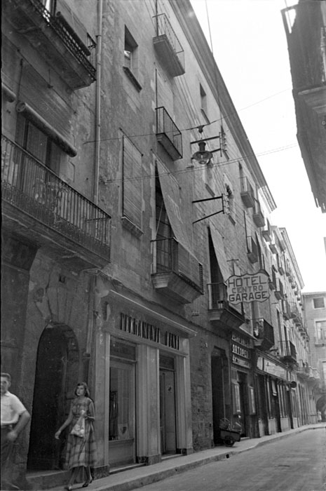 (Ampliar) - El carrer Ciutadans amb rètols comercials: Permanente Henri, Perfumeria Ortopedia Torrellas, al mig Hotel Centro. 1957. Miquel Morillo Gallego. CRDI - Ajuntament de Girona.