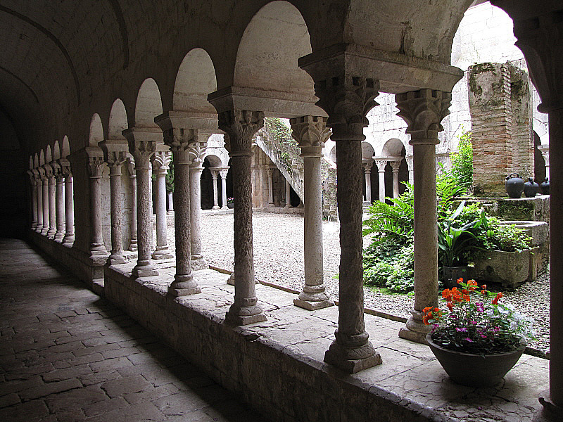 Del claustre gòtic, d'un estil netament mediterrani, bastit en un nou pis entre els anys 1427 i 1430 pel fuster i mestre d'obres gironí Pere Ciprés (1), només s'en van construir dues ales: les dels costats nord i est. Les obertures al pati interior ho fan mitjançat grups de tres finestres apuntades, separats per pilars rectangulars, quadrilobulades de pedra de Girona, damunt els quals es recolzen els arcs. Els capitells estan decorats amb motius vegetals i geomètrics molt senzills.