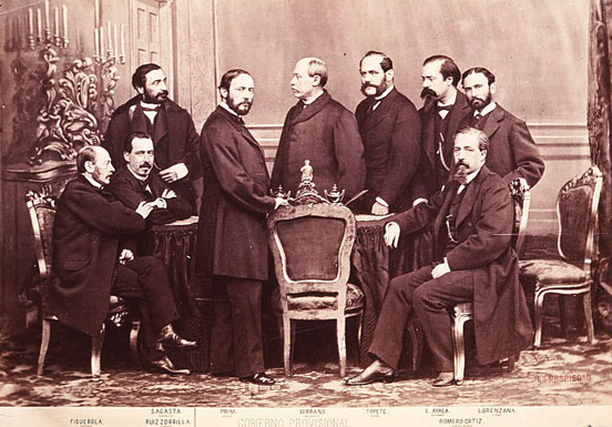 Fotografia de J. Laurent (1816-ca.1894). Govern Provisional de 1869. Figuerola, Sagasta, Ruiz Zorrilla, Prim, Serrano, Topete, López Ayala, Romero Ortiz i Lorenzana. Wikipèdia. (Ampliar imatge)