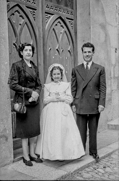 (Ampliar) - Primera comunió d'una nena a la capella del col·legi del Cor de Maria. Retrat de la família a l'exterior. 1952. Martí Massafont Costals. CRDI - Ajuntament de Girona.