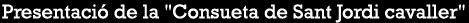 La "Consueta de Sant Jordi cavaller" és una mostra de teatre medieval religiós català, que tenia una funció pedagògica important, i que en aquest cas explica la coneguda llegenda d'una ciutat assetjada per un drac que Sant Jordi allibera després d'una lluita en què el bé triomfa sobre el mal. Un decorat de jardineria recrearà l'ambient d'un bosc de la Líbia medieval, mentre que la música la posarà l'orgue de la Catedral tocat per Pau Riuró Bofill, i entre l'attrezzo inclourà un drac que ha construït Nuxu Perpinyà i que s'incorporarà als gegants, capgrossos i altre bestiari popular de la ciutat.