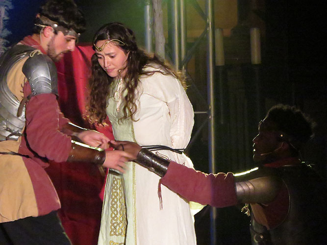 (Ampliar) - La filla del rei (Carla Ciurana) és lliurada al drac pels dos cavallers (Gerard Martínez i Mamadou Diallo).