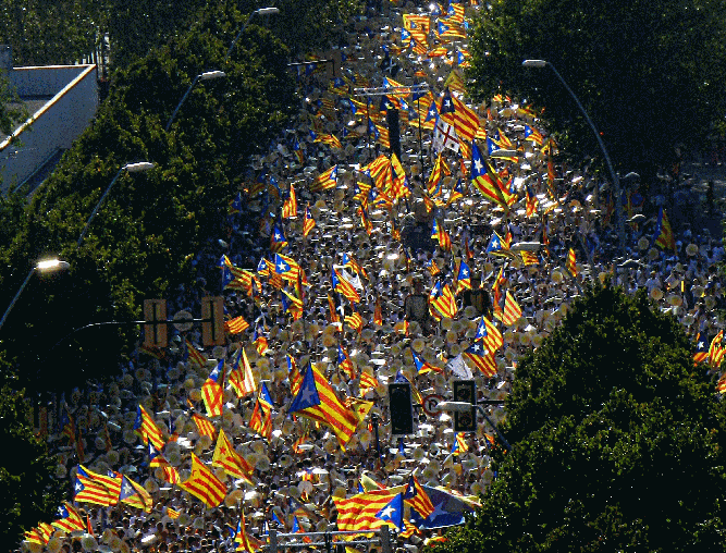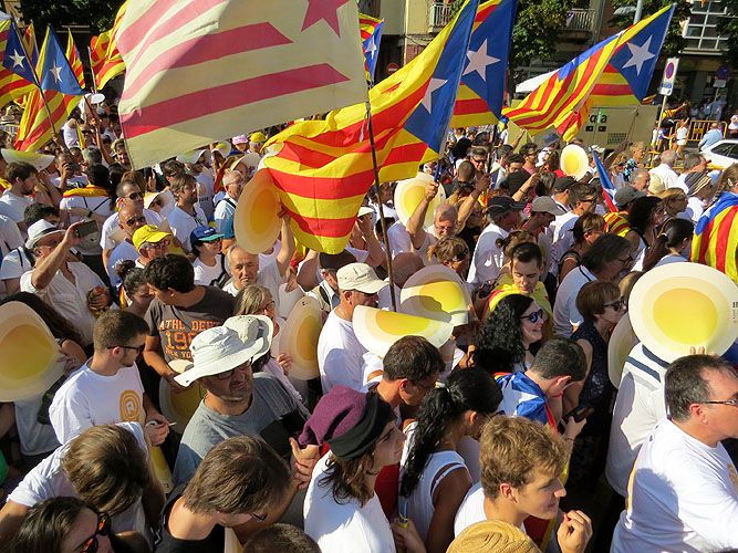 (Ampliar) - Part de la manifestació a Països Catalans. Fotografia d'Abraham Simon, gentilesa de l'autor.El passeig dels Països Catalans va ser l'escenari on es varen manifestar méss de 135.000 persones de totes les comarques gironines, excepte la Cerdanya i el Ripollès, que eren a Berga. Aquest acte descentralitzat va comptar amb la participació entre altres, del president de la Generalitat, Carles Puigdemont, el primer president que participa en la manifestació independentista, acompanyat a primera fila de nombrosos alcaldes, com el de Salt, Jordi Viñas, la de Girona, Marta Madrenas, consellers com Santi Vila i Dolors Bassa o l'adjunt a l'alcaldia de Perpinyà, Brice Lafontaine. L'acte va ser presentat per l'actor Quim Masferrer.