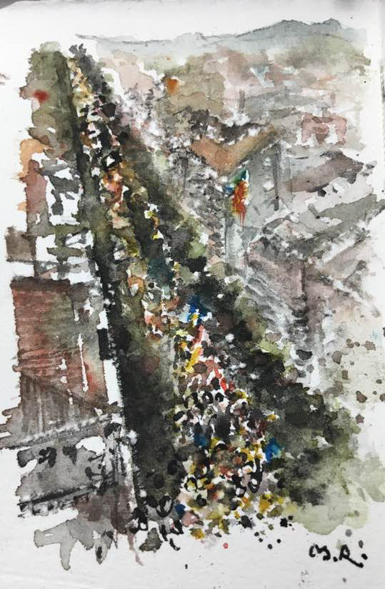(Ampliar) - La manifestació a Salt. Aquarel·la de Fonsu Mateu Riera. Gentilesa de l'autor.