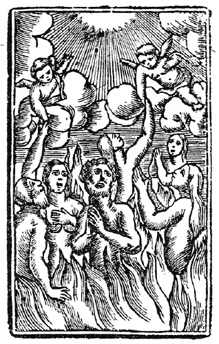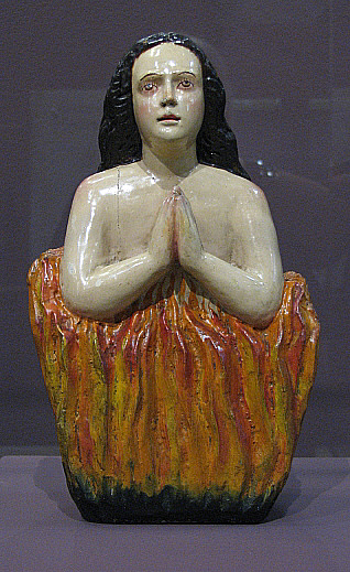 Representació d'ànimes del Purgatori, segons la simbologia tradicional. Rajola pintada. Producció de les fàbriques de València. Segona meitat del segle XIX.