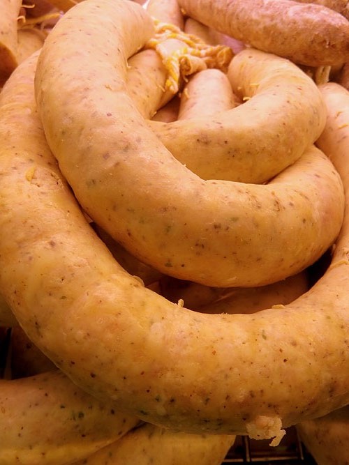 Elaboració. Trinxeu amb la màquina, més aviat fina, carn magra i part de cansalada, ho amaniu amb sal, pebre i hi barregeu uns ous. Un cop tot ben pastat, ompliu els budells, els punxeu vàries vegades amb una agulla, els lligueu les puntes amb fil i ho poseu a bullir a la caldera uns 45 minuts. Algunes persones només les escalden. Després de ben escorregudes,millor damunt d’un drap blanc, es pengen a fi que s’assequin una mica.