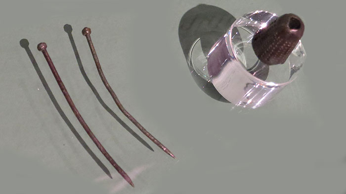 (Ampliar) - Didal de sastressa i agulles de cap. Segles XIII-XIV. Bronze. Procedeixen del pati inferior del Museu d'Història dels Jueus.