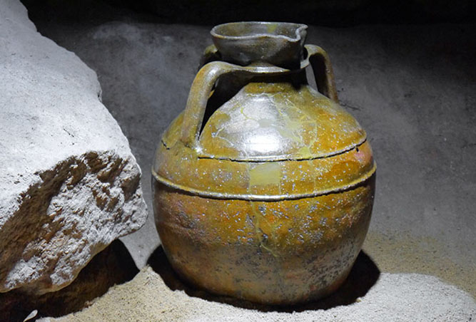 (Ampliar) - Gerra de tres nanses. Ceràmica vidriada. Segle XII-XIII. Trobada soterrada a la base d'un mur d'una casa que es va construir al Call de Girona al seggle XIII. Era plena d'ossets i de terra, potser també de cendres. Pel seu contingut misteriós i la seva conservació excel·lent, és un objecte destacat entre els que s'han trobat al Call gironí. Es conserva al Museu d'Història dels Jueus.