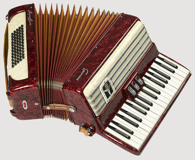 (Ampliar) - Acordió d'Agustí López i Gambau, Tinet. Ca. 1950, Plàstic i tela. Donació de la família López Ricart, 2019. A la planta baixa del Museu d'Història de Girona s'hi exposen els gegants i els capgrossos que en Tinet acompanyava amb el seu acordió quan ballaven en cercavila pels carrers de la ciutat.