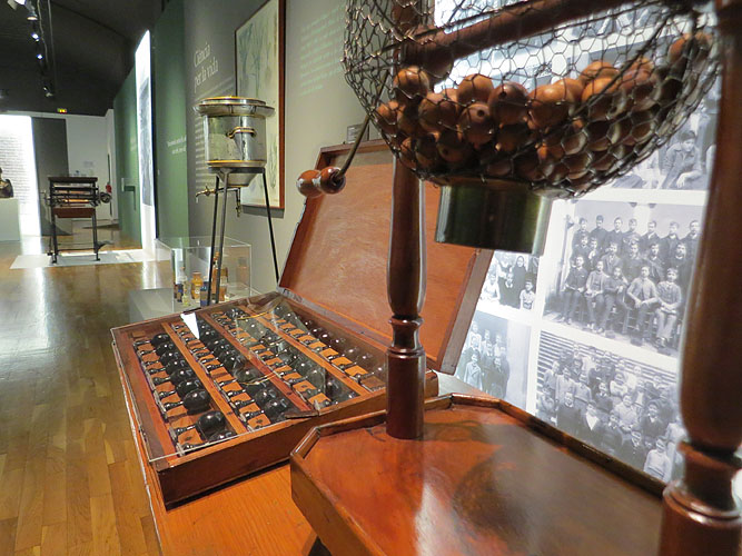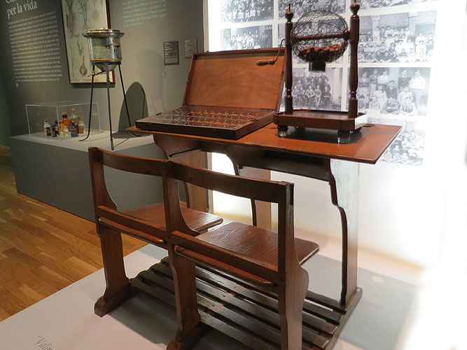 En aquestes làmines de colors, com si el vidre tingués un reservori de memòria, hi veiem l'infant i la nena avantatjada, l'aplicació en l'estudi, la pulcritud en els deures lliurats. El viscosímetre d'Engler, destinat a mesurar la viscositat d'un líquid, ens porta a la realitat pretèrita que el va acollir, a aquells gabinets, aquells experiments en grup amb el nas enganxat a l'aparell, i als ulls com taronges per veure-hi més enllà del petit món conegut de cadascú. La capsa de fusta té cinquanta compartiments per desar-hi els segells de goma amb el nom de les assignatures que s'impartien a l'Institut al segle passat. Cinquanta noms, de cinquanta mons. El bombo amb les boletes per al sorteig dels temes de l'examen de revàlida remet a l'escenari imponent on es desenvolupava la prova, a la solemnitat del tribunal, a l'explicitat de la disjuntiva que tenallava l'alumnat, a una veritable cerimònia de pas que la cultura occidental havia dissenyat com a entrada al món seriós dels adults. Els flascons guardaven una representació de les substàncies pures i mesclades a partir dels 118 elements químics catalogats. Estris de laboratori, de tota forma i color, que com fireta per a batxillers eren el fil tensat entre una infantesa acabada de deixar i una vida adulta encara a l'horitzó de la incertesa.