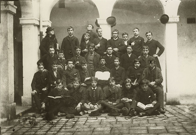 (Ampliar) - Retrat d'un grup d'alumnes al claustre de l'Institut d'Ensenyament Mitjà. 1880. Autor desconegut. CRDI - Ajuntament de Girona.