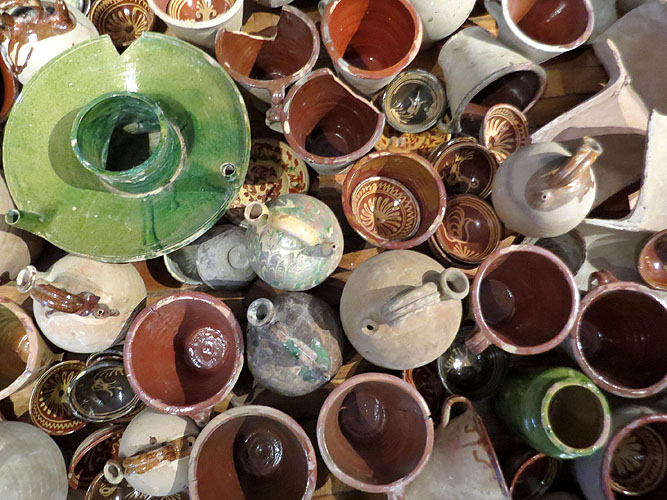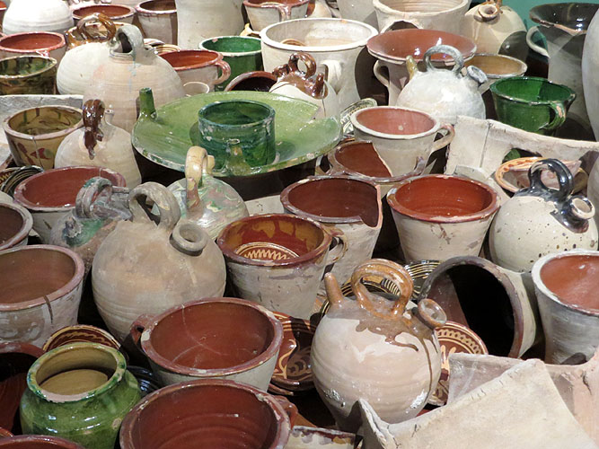 (Ampliar) - Terrissa de volta. Conjunt ceràmic trobat en una casa de la plaça del Vi. Segle XVIII-XIX. Aquestes gerres, escudelles, olles, plats, gibrells, càtirs i tupins es varen utilitzar per farcir el carcanyol, l'espai entre els arcs de'una volta, durant la construcció d'un edifici. En els segles passats, la ceràmica que es malmetia en una cuita, generalment a causa d'un excés de temperatura, s'usava amb aquesta finalitat, perquè és un material de poc pes, que no carregava excessivament les voltes.