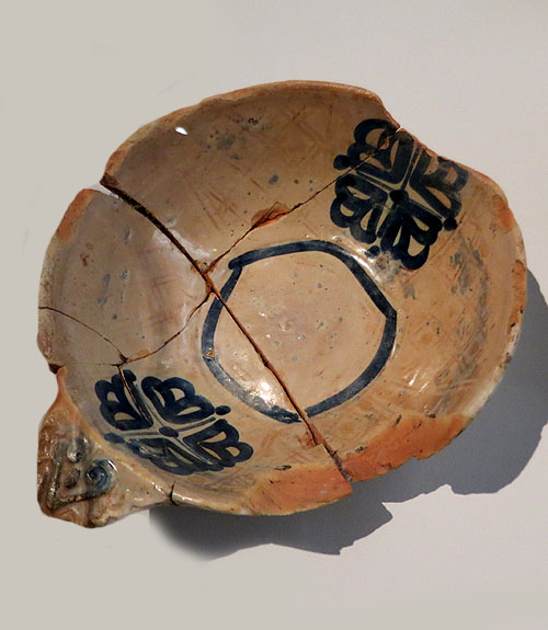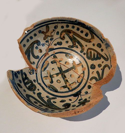 (Ampliar) - Escudella de vaixella medieval. Segles XIV-XV. Ceràmica pisa amb decoració en blau català i reflexos Metàl·lics. Procedeix de l'edifici del Museu.
