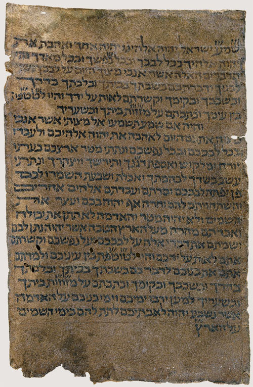 (Ampliar) - Mezuzà. Segle XV. Tinta sobre pergamí. Procedeix del Call de Girona. Museu Bíblic de Girona. La mezuzà és un petit pergamí que conté uns versets del Deuterenomi que són la professió de fe del poble jueu: 'Escolta, Israel, el Senyor és el teu Déu, el Senyor és U'. Es diposita enrollat i dins una capseta al brancal dret de les portes, i es toca en entrar i sortir de casa, complint amb el precepte judaic. Al Call de Girona s'hi conserven diverses escletxes per posar-hi la mezuzà. Aquesta va ser trobada emparedada en una casa del carrer de la Força, als anys vuitanta del segle XIX.