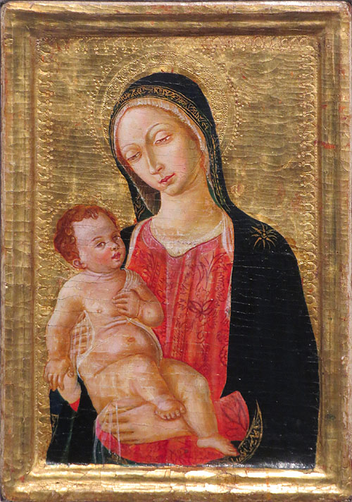 (Ampliar) - Madonnina. Autor desconegut (falsament atribuït a Matteo di Giovanni). S.d. Tremp sobre taula. Adquirida a Roma el 1913. Arribada a Montserrat, l'abat Marcet l'oferí a la Sra. Amatller, qui havent consultat Mn. Josep Gudiol, la va refusar. J. Soler i Palet tampoc l'acceptà. L'abat la va tornar a Roma al marxant Giuseppe Gonnella, segurament l'autor de la falsificació, qui no va passar a recollir-la i quedà en propietat del monestir. Uns prestigiosos historiadors d'art italians van assegurar que l'autor havia de ser Matteo di Giovanni, i així va figurar una vintena d'anys, fins que Liliana Barroero assegurà que era una falsificació.