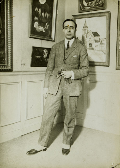 (Ampliar) - Celso Lagar fotografiat a la Galerie Percier (París) amb motiu de l’exposició conjunta amb Hortense Begué que hi van celebrar el 1923. Autor desconegut. Archivo Celso Lagar.