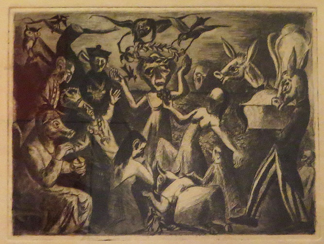(Ampliar) - Aquelarre. Joaquim Datsira Prunés. 1950. Punta seca. Espai Subirachs, Barcelona. |