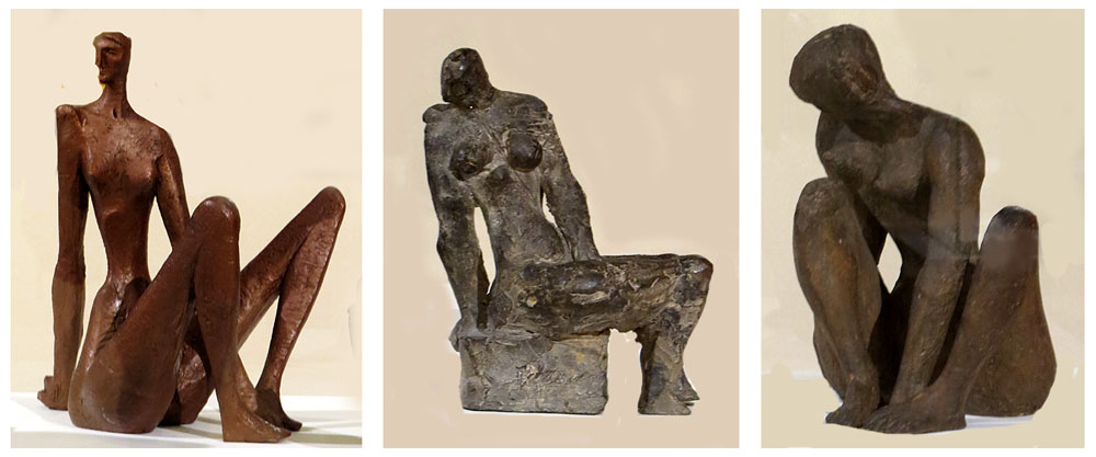 (Ampliar) - D'esquerra a dreta: Figura asseguda. Josep M. Subirachs. 1953. Terracota. Espai Subirachs, Barcelona. / Esbós per a figura asseguda. Josep M. Subirachs. Ca. 1953. Fang. Col·lecció de la família Torres / L'espera. Esther Boix Pons. 1951. Terracota. Col·lecció de la família Creus Boix.