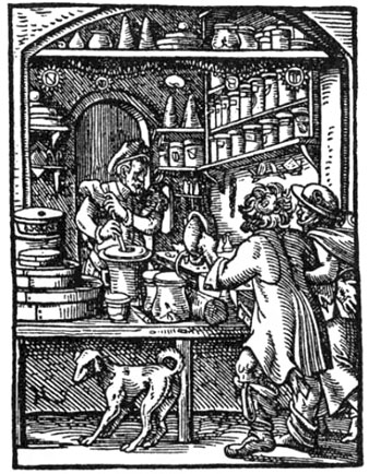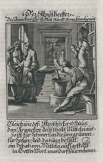 Els albarels i les urcèoles són de ceràmica vidriada amb decoració vegetal de tonalitat blau cobalt. Cadascun d’ells porta inscrit el nom en llatí de la substància que contenia, dins un rètol, que sol tenir forma de trèvol o disposar-se en diagonal. Per preservar el producte, els pots tenen una tapa metàl·lica policromada.