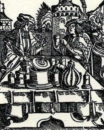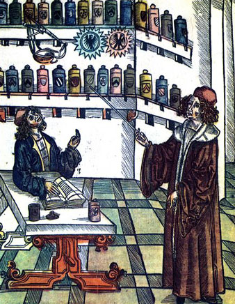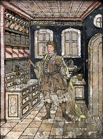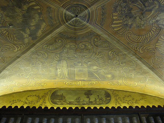 (Ampliar) - La volta de la farmàcia, decorada amb temes d’al·legories de manipulacions galèniques.