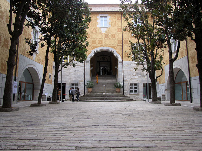 L’antic Hospital de Santa Caterina de Girona, construït a mitjans del segle XVII, gira entorn d’un gran pati interior anomenat Pati de les magnòlies, a l’extrem sudest del qual s’hi troben les portes que donen accés a la farmàcia, que no va ocupar aquesta estança fins al segle XVIII, i no va ser fins a la meitat del mateix segle, que va assolir un ampli i destacat nivell professional.